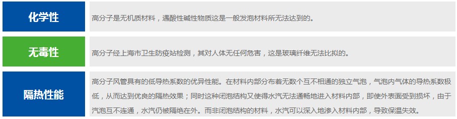 隔熱性能:高分子風管具有的低導熱系數的優異性能。在材料內部分布著無數個互不相通的獨立氣泡,氣泡內氣體的導熱系數極低,從而達到優良的隔熱效果;同時這種閉泡結構又使得水汽無法通暢地進入材料內部。